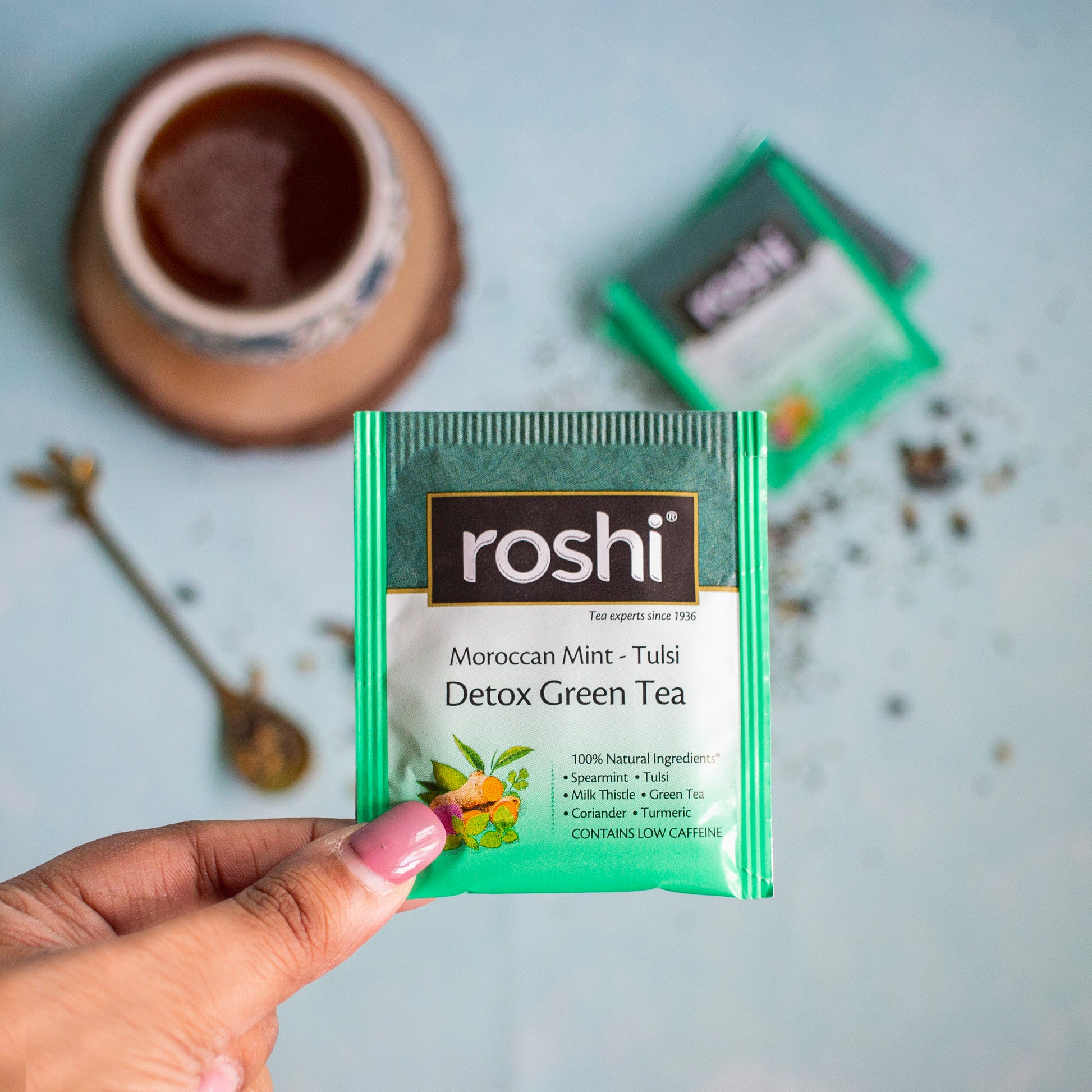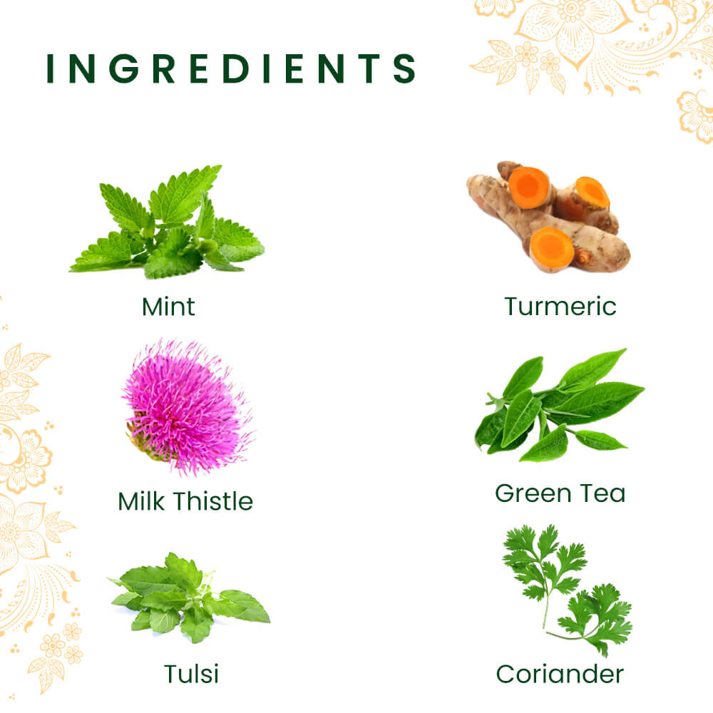 - Ingredients - Mint, Turmeric, Milk Thistle, Green Tea, Tulsi, Coriander